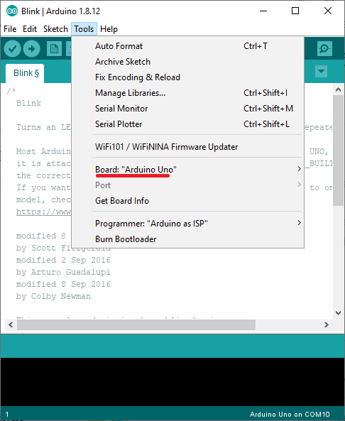 After selecting the board go to Port and select the right communication port. Hit the Upload button.